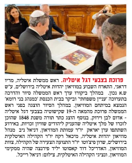 "מצב הרוח" - ידיעה בעלון השבת אודות ביקור ראש ממשלת איטליה במוזיאון יהדות איטליה בירושלים.
